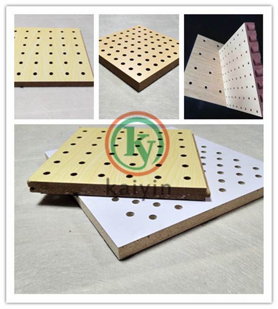 1、凯音品牌孔木吸音板介绍:孔木吸音板有贯通于密度板正面和背面的圆柱形孔眼, 在密度板背面粘贴具有透气性的背覆材料和能吸收入射声能的吸声材料等组台而成。吸声机理是材料内部有大量微小的连通的孔隙, 声波沿着这些孔隙可以深入材料内部,与材料发生摩擦作用将声能转化为热能。多孔吸声材料的吸声特性是随着频率的增高吸声系数逐渐增大,这意味着低频吸收没有高频吸收好。孔木吸音板做成的天花板或墙板等,这种结构的吸声机理是薄板共振吸声。在共振频率上,由于薄板剧烈振动而大量吸收声能。